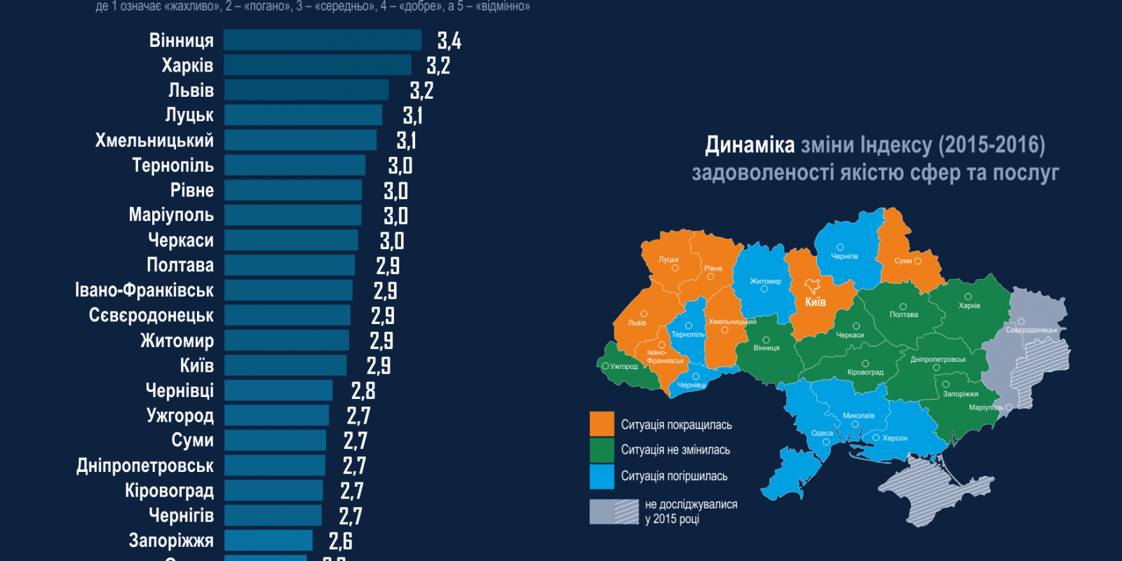 В минулому, 2016 р. ситуація майже не змінилися. Хоча тенденція до погіршення якості послуг в місті саме тоді й почала змінюватись. Так, в 2016 р. Тернопіль перестав входити в 5-ку лідерів в якості роботи шкіл, ДНЗ, культури. Майже не змінився стан справ в інших галузях.