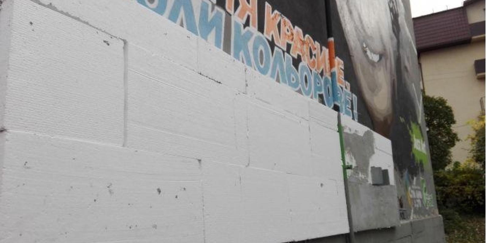 Мова йде про будинок з портретом Кузьми Скрябіна, що по вул. Хмельницького 43. Мешканці почали утеплювати будинок і вже заклеїли частину муралу. Нагадаємо, мурал був намальований в 2016 р. Художникам не вистачало коштів на фарбу і вони звернулися до спонсорів. Останні гроші виділили, але попросили згадати їх компанії в зображеному малюнку. Ось тому внизу знаходяться написи назв компаній-спонсорів. Саме їх вже заклеїли.